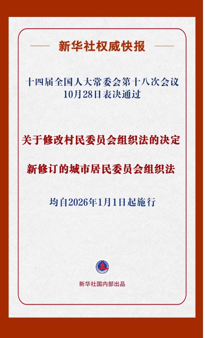 据新华社报道,10月28日,第十四届全国人大常委会第十八次会议表决通过关于修改村民委员会组织法和新修订的城镇居民委员会组织法的决定,均将于2026年1月1日举行。随着我国国情的变化,修改比拉格尔委员会组织法和新人民委员会组织法的决定改变了新的村民委员会组织法和新修订的城镇居民委员会组织法的决定。人们和新改变的村民和新改变和新改变的新国家和新改变的人民的新法律和新改变的新的。 《城市居民委员会组织法》明确,村委会、居委会下设委员会设立“老年妇女儿童工作委员会”,进一步加强对老年人和(留守)儿童的统筹照顾。改变有机La的决定《村民委员会法》增加了未设立农村集体经济组织的,村民委员会、村民小组可以依法履行集体经济组织的职能,进一步明确了村民委员会、农民经济法案与农村集体建设法法律的关系。新修订的城市居民委员会组织法增加了居民委员会协助指导和监督业主大会、业主委员会依法履行职责,帮助调解产权纠纷的规定。编辑 毛天宇