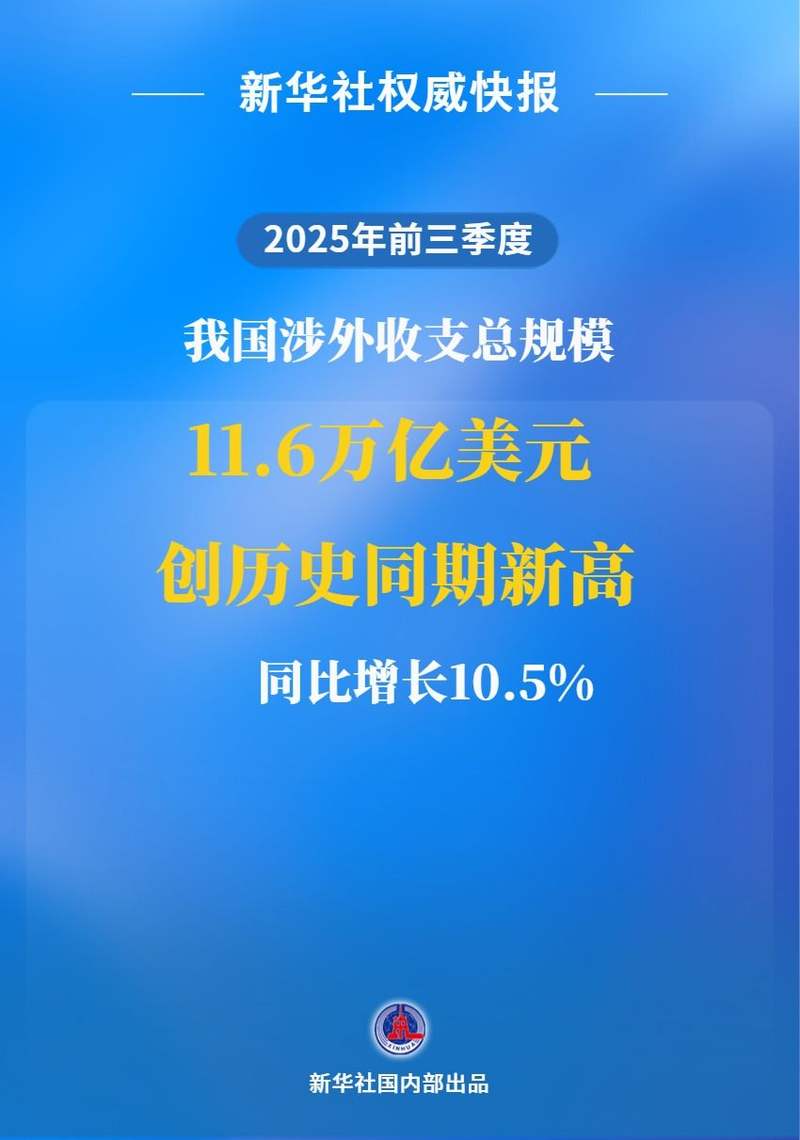 据新华社报道,国家外汇管理局10月22日公布的数据显示,今年前三季度,我国涉外收支11.6万亿美元,创历史同期新高,同比增长10.5%。跨境资金净流入1197亿美元,银行结汇和超额售汇632亿美元,均高于去年同期。今年以来,我国外汇市场持续运行、预期稳定,表现出较强的稳定性和活力。辛静编辑