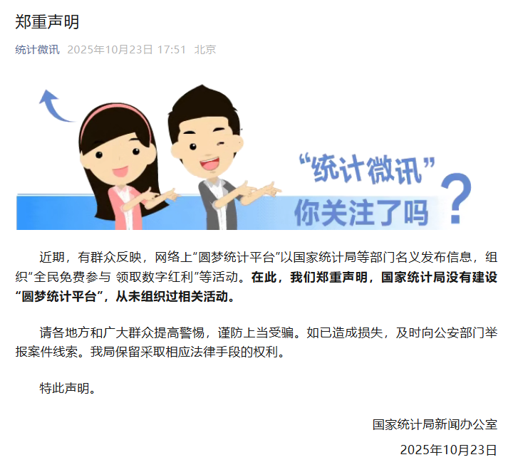 新京报10月23日消息,国家统计局信息发布严正声明:近日,有人举报网络上“圆梦统计平台”以国家统计局等部门名义发布信息,组织“免费参与,人人领取数字红利”等活动。在此,我们郑重声明,国家统计局未搭建过“梦想统计师平台”,也未组织过相关活动。请各地和广大群众提高警惕,谨防上当受骗。造成损失的,立即向公安部门报告案件线索。国家统计局保留采取适当法律措施的权利。辛静编辑