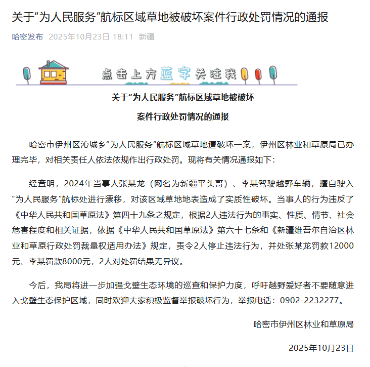 新京报讯 据哈密微信公众号发布的消息,伊州区林业和草原局已完成哈密市相关区秦城及农村秦城乡“为人民服务”通航航区草地损坏案件,并追加处罚。 ——依照法律、法规的规定对相关责任人员进行管理。现将相关情况通报如下:经查明,2024年,涉案当事人张某龙(网名新疆平头哥)、李某将车辆推离道路,擅自骑在“送人”导航标志上并漂移,对辖区草地造成较大破坏。当事人的行为违反了《中华人民共和国草原法》第四十九条的规定。根据两人违法行为的事实、性质、情节、对社会的损害程度及相关证据并根据《中华人民共和国草原法》第六十七条和《新疆维吾尔自治区林业草原行政处罚适用自由裁量权的建议》,责令二人停止违法行为,对李某处以12000元罚款,对李某处罚款8000元。两人对判罚结果并无异议。今后,哈密市益州区林业和草原局将进一步加强对戈壁生态环境的检查和保护,并呼吁越野爱好者不要随意进入戈壁生态保护区。同时,欢迎大家积极监督、举报破坏行为。举报热线电话:0902-2232277。辛静编辑