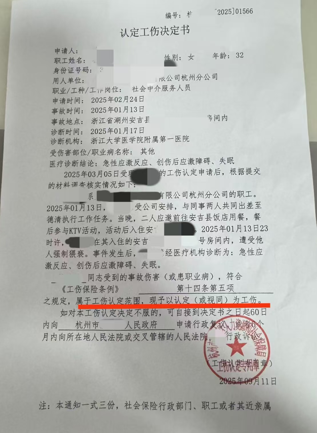 浙江一女子出差时被客户强行玩弄,造成精神创伤。人力资源和社会