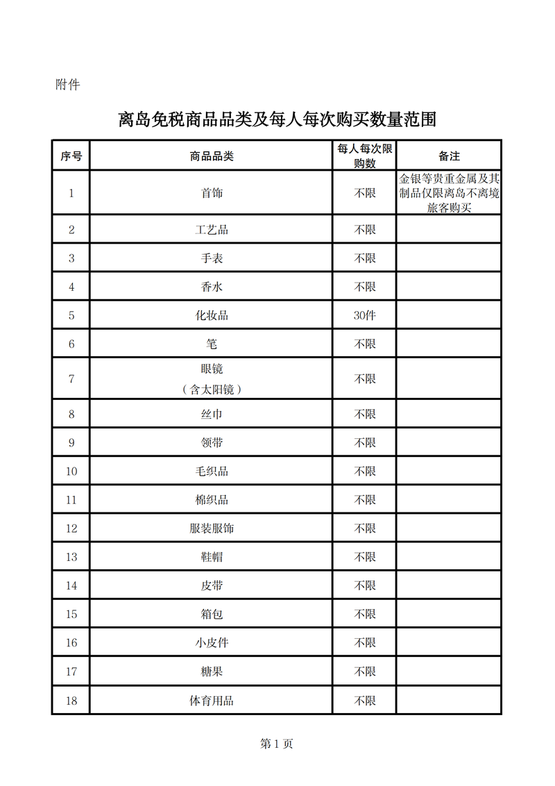 新京报10月17日消息,财政部等三部门发布关于调整海南离岛游客免税购物政策的公告。为进一步扩大政策影响,支持海南自由贸易港建设,海南离岛游客免税购物政策调整(以下简称新品类产品音乐动物用品、便携式乐器),将“家用空气净化器及配件”品类调整为“小家电”品类,新增扫地机器人、吸尘器、 等等;将“可穿戴设备及其他消费电子产品”类别整理为“电子消费产品”类别,新增数字设备及配件、微型无人机;将鼠标和键盘等数字配件添加到“平板电脑”类别中。调整后共有47个离岛免税品类。具体类别、采购数量、语句要求见附件,请按要求执行。 2、具有外岛免税品经销资格的经营企业,购买丝巾(附件8号,下同)、服装服饰(12号)、鞋帽(13号)、咖啡(23号)、陶瓷制品(号)等国内商品,进入岛内免税店,按出境政策销售,免收离岛费,视为出口,可退还增值税和消费税 (豁免)。内销商品,上述经营单位可按规定向海关办理出口报关手续,并向主管税务机关办理退税手续。具体征管和退税方案由海关总署另行制定。会同财政部、国家税务总局。 3、出境海岛游客免费购物年龄由16周岁调整为18周岁。 4.允许“离岛及境外旅客”享受离岛免税购物政策。离岛出境旅客是指年满18周岁、已购买从海南出境的机票或船票、持有有效出入境证件、实际出境的境内外旅客,包括海南省居民。离岛出境游客购买的免税商品价值计入年度10万元免税购物额度,不限次数。免费产品类别及单次购买数量限制按附件执行。离岛、出境旅客可免税购买免税店或经批准的网上销售网点在规定金额和数量范围内的商品。免税店将根据旅客离岛时间发货。旅客只能凭购物券在机场、港口、航站楼指定区域提货,并在离岛时一次性带走。 5、一年内有离岛记录的岛民,可在一年内通过“即买即提”提货方式无限次购买离岛免税商品。政策实施当年,离岛备案须自本公告实施之日起(含当日)发生。海南省政府要切实承担起防控“套购”走私危害的主体责任。岛内居民是指年满18周岁、持有海南省身份证的中国公民、海南省居住证或社会保障卡,以及在海南省工作、居住并持有居住证的外国人。六、免税海岛免税政策其他内容 根据《财政部、海关总署、国家税务总局关于离岛总局旅客免税购物政策的公告》(公告编号)的相关规定,本公告自2025年11月1日起施行。调整海南离岛旅客免税购物政策,满足消费者多样化购物需求。 为持续推进海南自由贸易港建设,更好满足消费者多样化购物需求,财政部拟扩大离岛免税商品范围,新增毛绒动物用品、便携式乐器、微型玩具等产品nes,以及小家电。优化后,离岛免税商品种类由45类增加至47类。二是允许服装鞋帽、陶瓷制品、丝巾、咖啡、茶叶等国内产品在离岛免税店销售,增值税、消费税退(免)税。三是将离岛游客免费购物年龄由16岁调整为18岁。四是允许出境旅客享受离岛免税政策。离岛游客购买的免税商品价值计入年度10万元免税购物额度,不限次数。五、一年内有离岛记录的岛民,可按照规定多次购买离岛免税商品。历年“即买即取”的配送方式。此次政策调整,有利于扩大免税政策惠及范围,增加商品供给,改善消费者购物体验,增强岛内居民的实惠感,推动海南自由贸易港建设取得新成效。编辑刘嘉妮