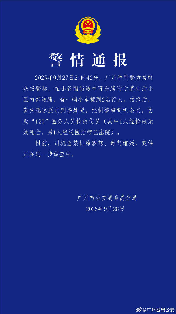 北京的新闻于9月28日,警方的广州公共安全局分支机构发布了一份警方报告,其中包括以下内容:2025年9月27日21:40,广州的Panyu警察收到了公众收到公众的报告,称一辆小型汽车撞到了两辆小型汽车袭击者,Xiaogwid Street。收到报告后,警方迅速将工作人员派往现场处理事件,控制司机金,并协助“ 120”医务人员营救了受伤的受伤者(其中一名未能营救后死亡,另一名在被送往医院治疗后将其从医院释放)。目前,驾驶员金已经确定了涉嫌酒后驾驶和毒品驾驶的怀疑,此案正在进一步调查中。编辑李Yilinzi